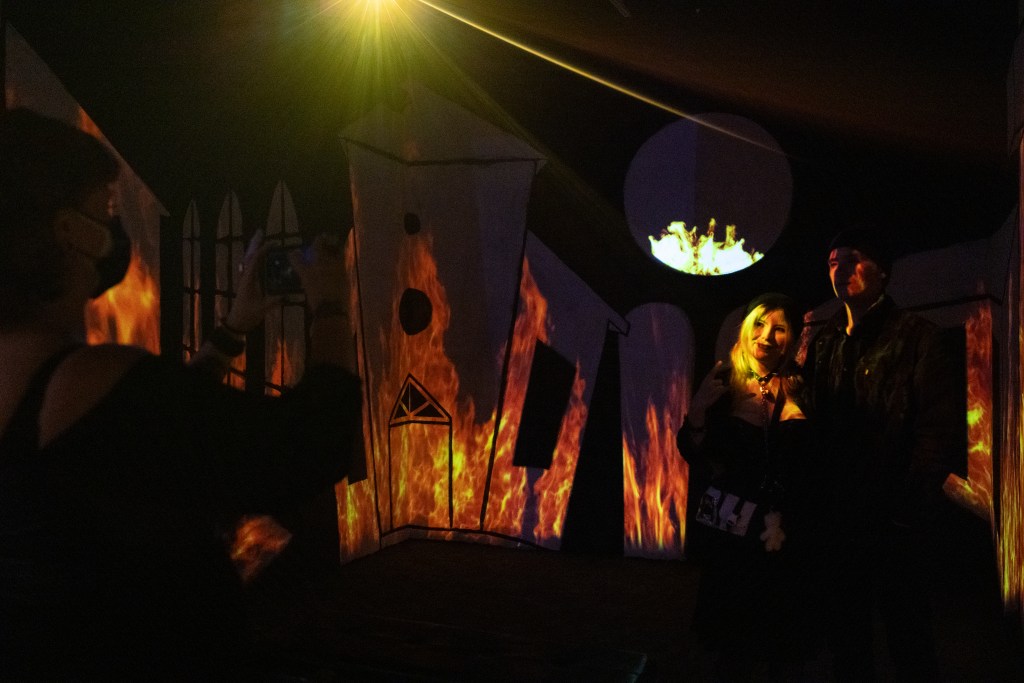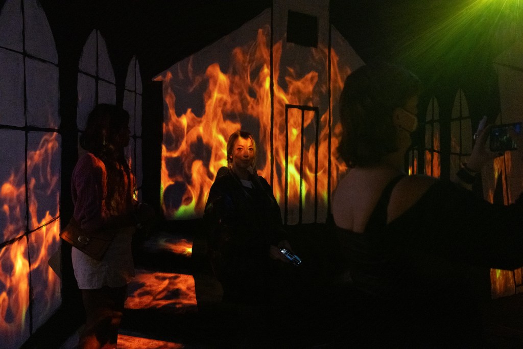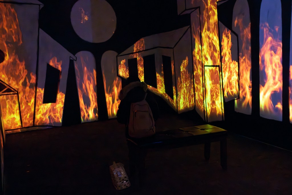 Detail of Slash N’ Burn, 2024, four-wall mural installation with video projections, room approx. 24’x12′, mural is approx. 13′ tall. Projection mapping by Jaymez. Photo by Theo Pelmus. Featured in WARPAINT.Detail of Slash N’ Burn, 2024, four-wall mural installation with video projections, room approx. 24’x12′, mural is approx. 13′ tall. Projection mapping by Jaymez. Photo by Theo Pelmus. Featured in WARPAINT.Detail of Slash N’ Burn, 2024, four-wall mural installation with video projections, room approx. 24’x12′, mural is approx. 13′ tall. Projection mapping by Jaymez. Photo by Theo Pelmus. Featured in WARPAINT.