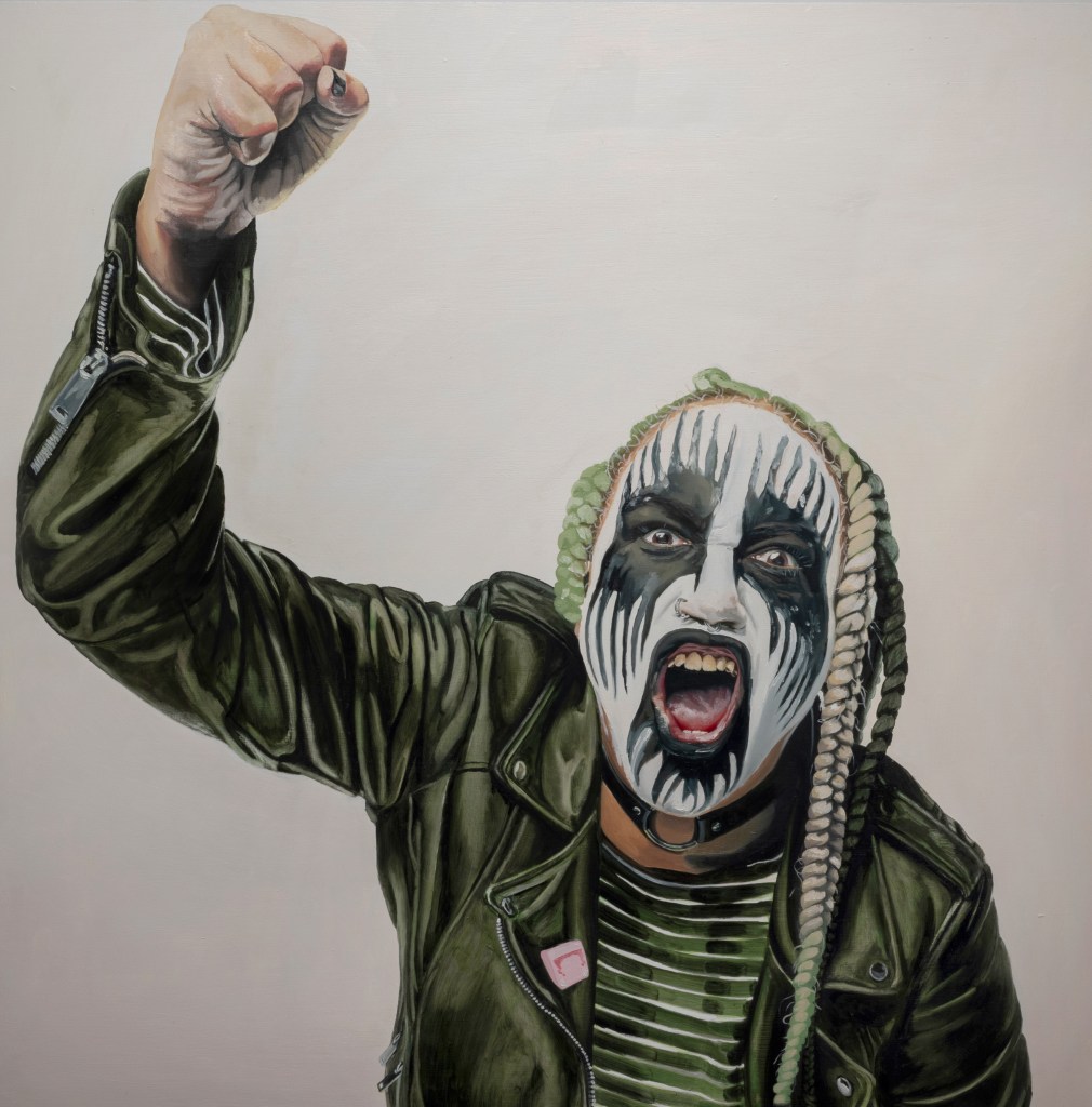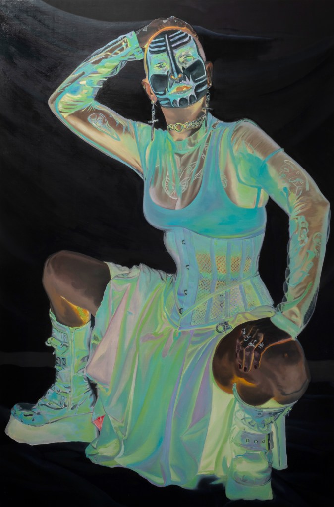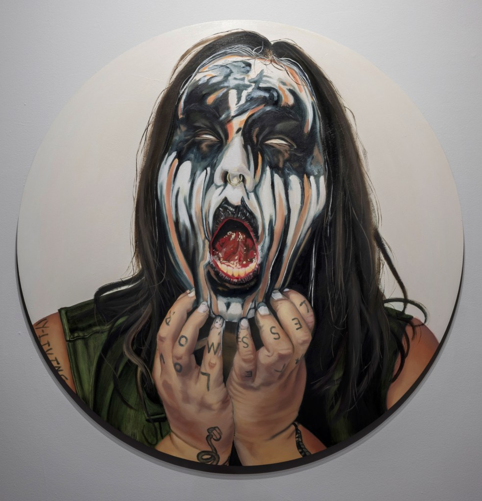 Inward Scream, 2023, oil and latex paint on round wood panel, 40″ diameter, featured in WARPAINTBare Your Teeth, 2023, oil and latex paint on wood panel, 36″x48″, featured in WARPAINTI am the queer with their fist raised out of Black love, 2023, oil and latex paint on panel, 40″x40″, featured in WARPAINTUnder A Blood Moon, 2023, oil and latex paint on wood panel, 24″x24″, featured in WARPAINTDon’t You Dare (Look Away, Boy), 2023, oil and latex paint on wood panel, 40″x40″, featured in WARPAINT