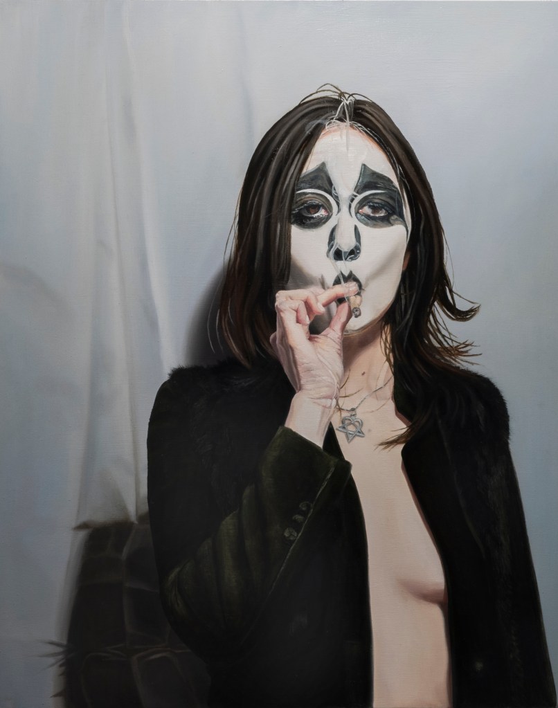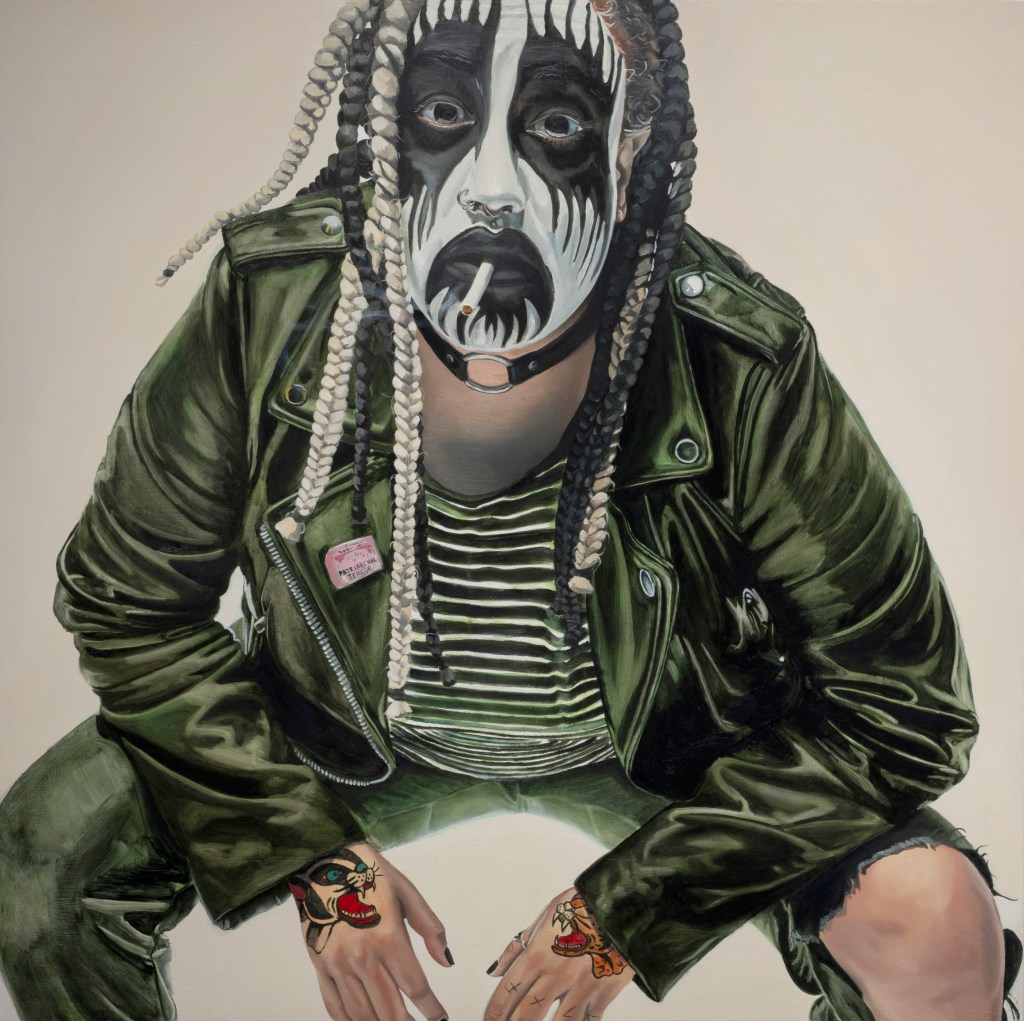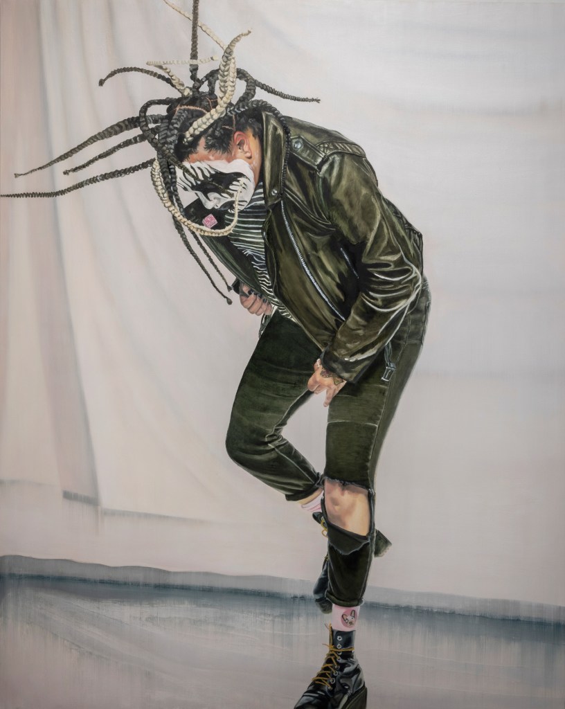 Alter Ego, diptych, 2023-24, oil and latex paint on wood panel, 80″x60″ (both panels; 40″x60″ each), featured in WARPAINTAlter Ego, left side, 2024, oil and latex paint on wood panel, 40″x60″, featured in WARPAINTAlter Ego, right side, 2023, oil and latex paint on wood panel, 40″x60″, featured in WARPAINT